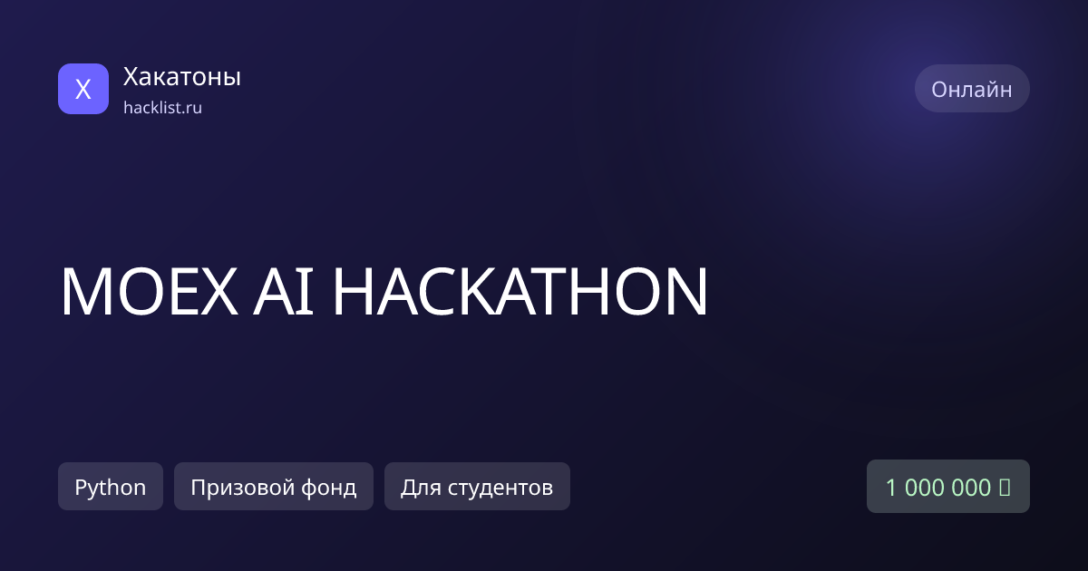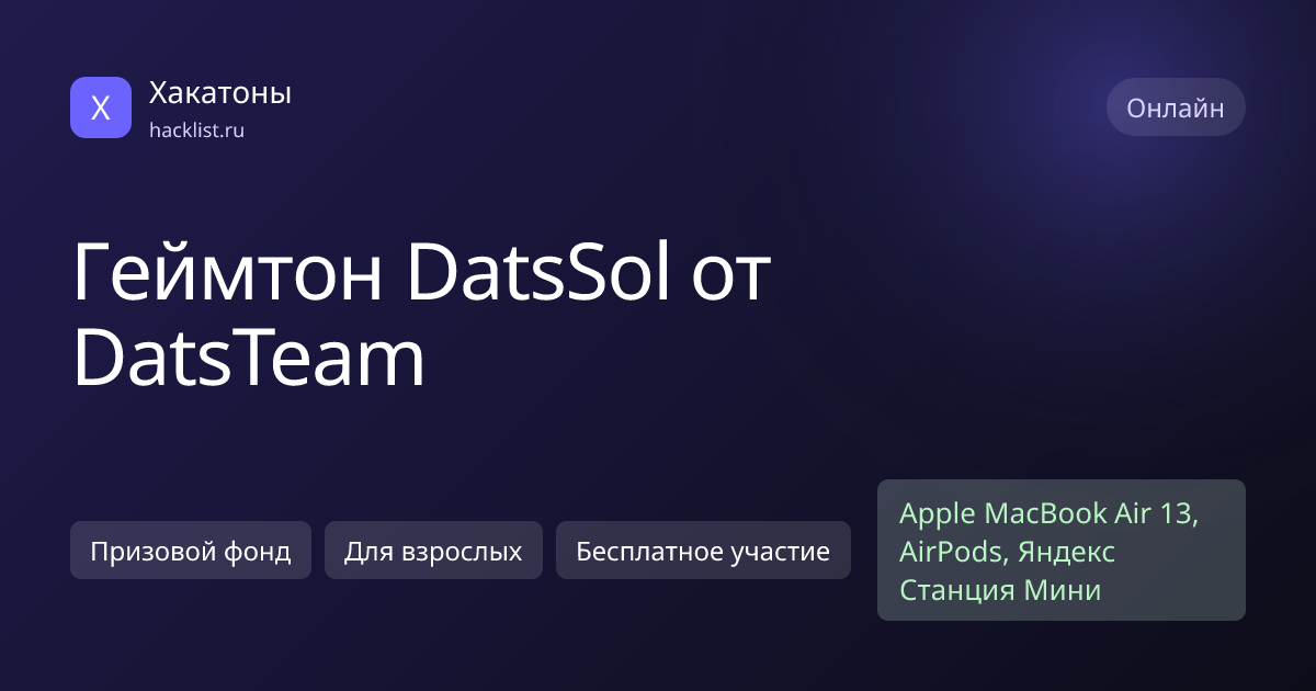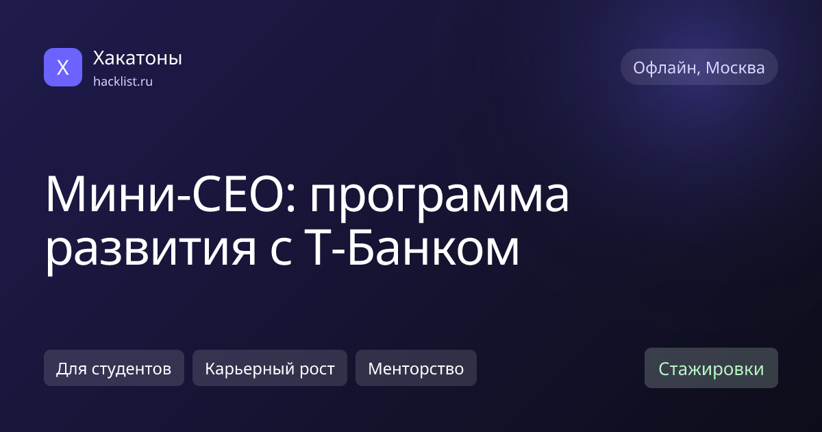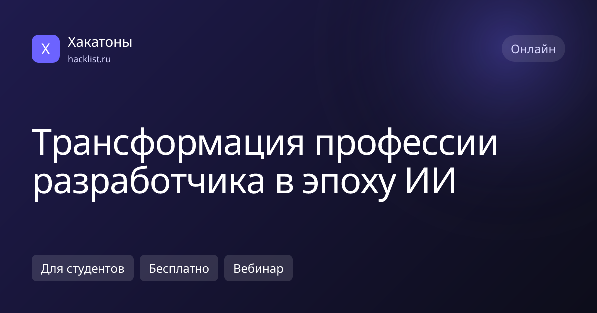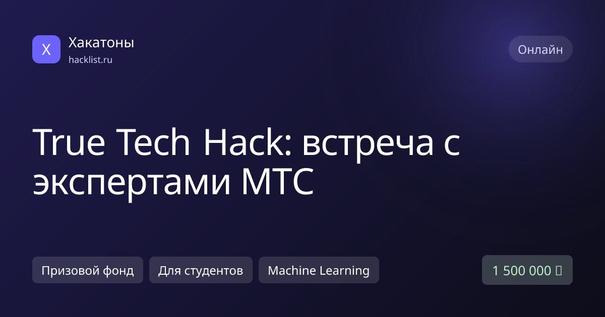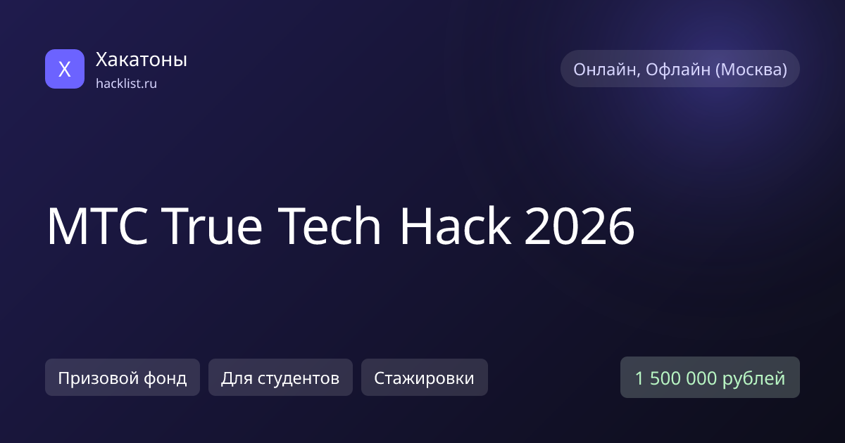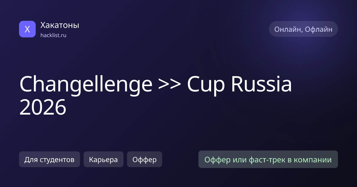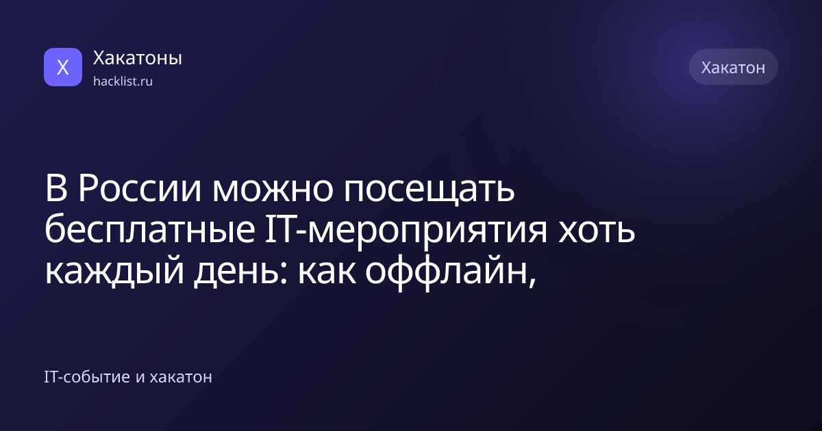 Hacklist.ru — календарь для тех, кто ищет хакатон в России, хакатон РФ или зарубежные онлайн-соревнования. Здесь — ближайшие хакатоны и анонсы по всей стране: хакатоны России собраны вместе с IT-состязаниями, даты и регистрация — на карточках выше.